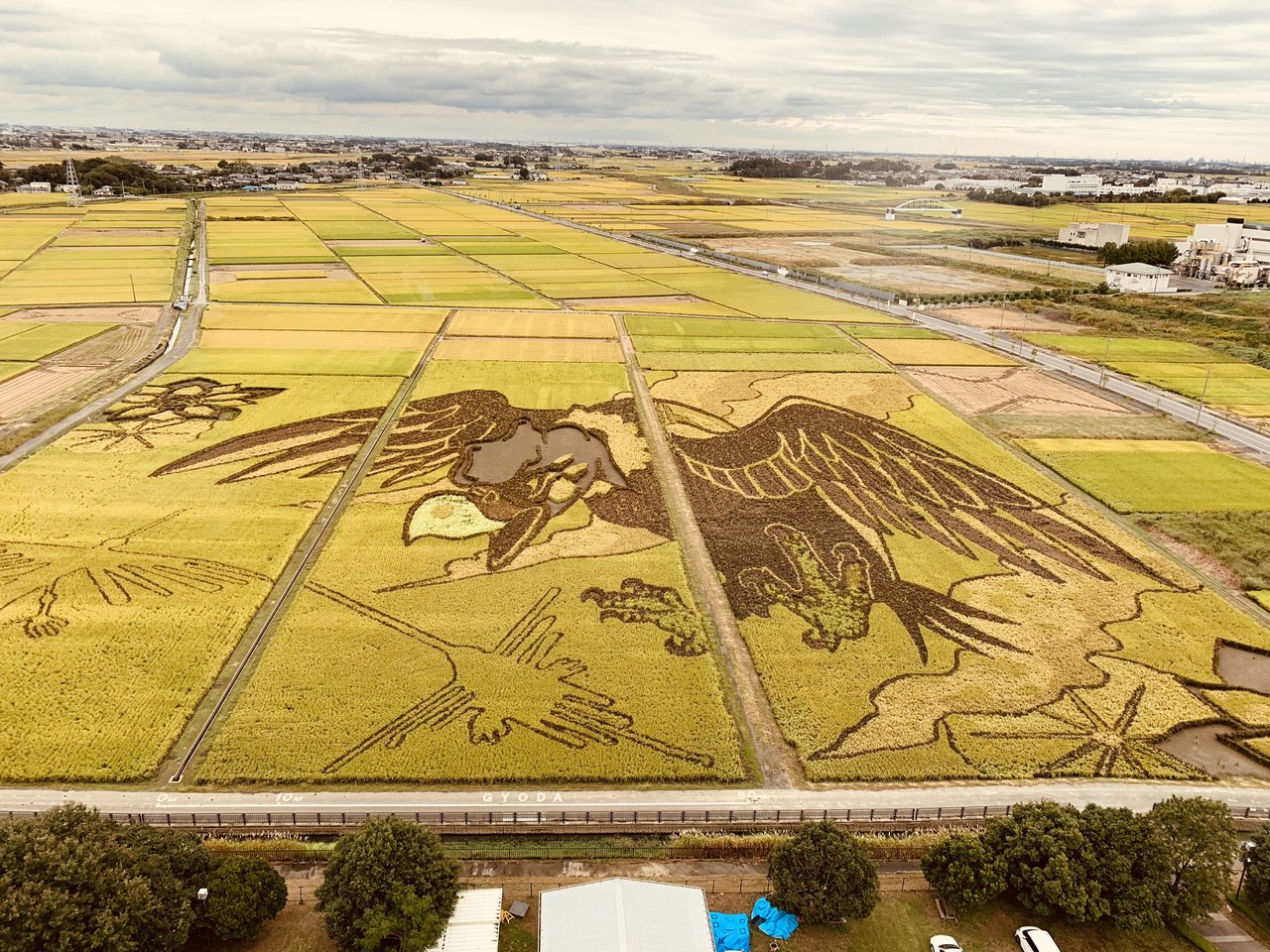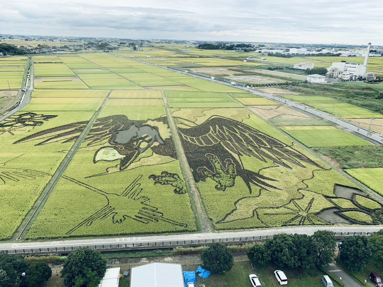 ペルーのナスカの地上絵を彷彿とさせる田んぼアート。コレを公園内にある『古代蓮会館』というタワーの展望室から見る為に訪れたのです!2015年には「最大の田んぼアート」としてギネス世界記録TM(公式認定記録:27,195平方メートル)に認定されたという、ワールドワイドなクリエーチャーを、埼玉在住の私が見逃すワケはありません!