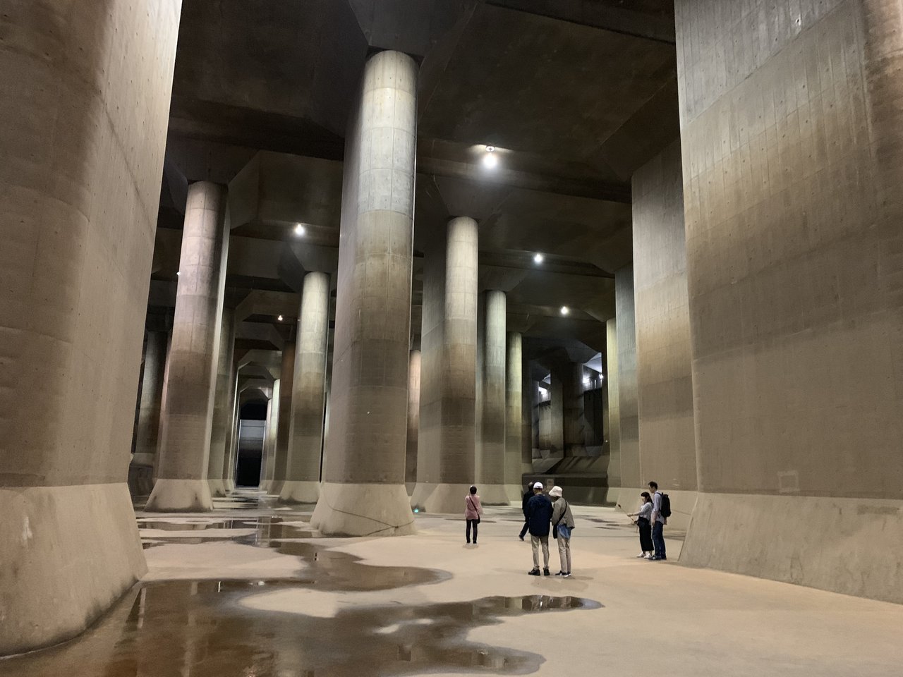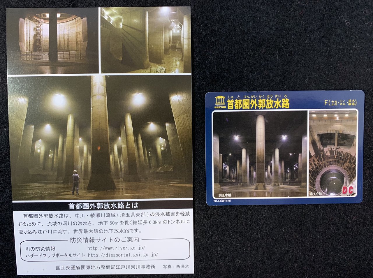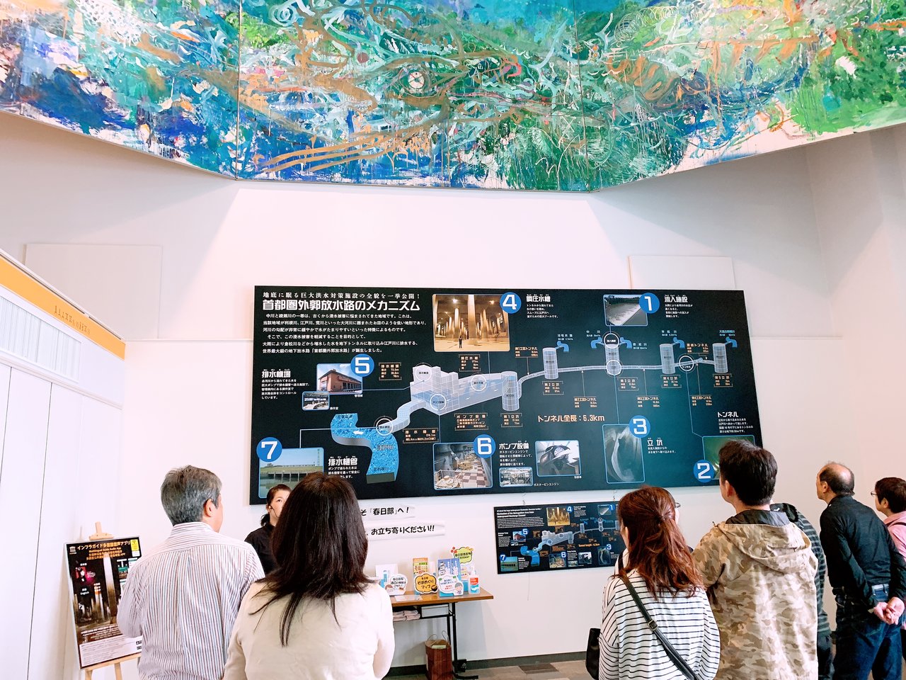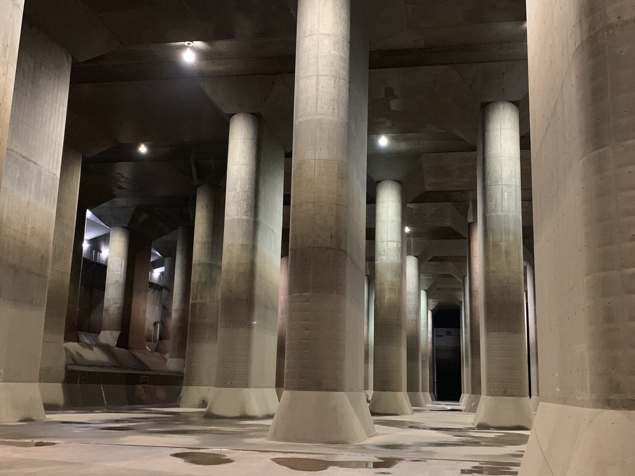 春日部市など埼玉県東部の低平な地域を洪水から守るために、地下50mに建設された長さ約6.3kmの地下放水路です。大雨が降った時にこのシステムが稼働し、周辺地域の河川から水を施設に流入させ、江戸川に排水することによって、地域の浸水被害の軽減に役立っているのです。