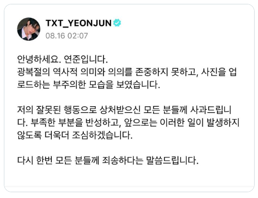 「こんにちは。ヨンジュンです。光復節の歴史的意味と意義を軽視せず、自分を振り返る貴重な時間を持ちました。私の間違った行動で傷ついたすべての方々にお詫び申し上げます。不適切な部分を反省し、今後このようなことが起こらないよう、より一層注意いたします。再度、すべての方々に心からお詫び申し上げます。」
