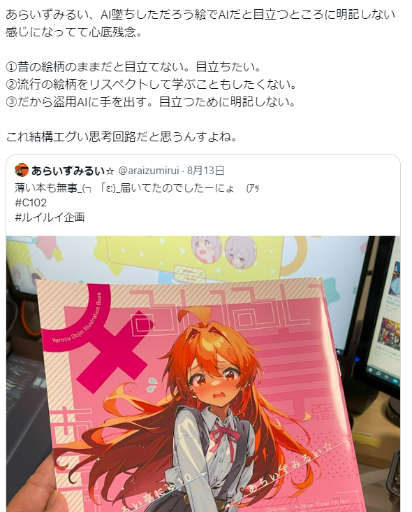 反AI「勝手にAI疑惑をかけられて叩かれたあらいずみるい先生かわいそう!こんな事が二度と起きないように生成AIを法規制するべき!」???…????!