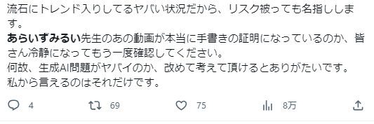 あらいずみるい先生を生成AIだと散々叩いておいて風向きがやばくなったので、今度は検証動画自体を捏造呼ばわりしてて最高に見苦しい。 https://t.co/2ha8tvUmfw