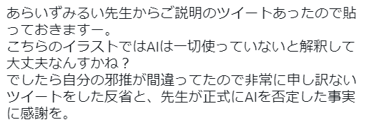 でしたら自分の邪推が間違ってたので非常に申し訳ないツイートをした反省と、先生が正式にAIを否定した事実に感謝を。https://t.co/7SaUXeyfpD